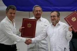 ¿Paz en Colombia, pero no en Cuba? El presidente colombiano Juan Manuel Santos (izq) con el comandante Timoleón Jiménez de las FARC (der), acompañados por el gobernante ...